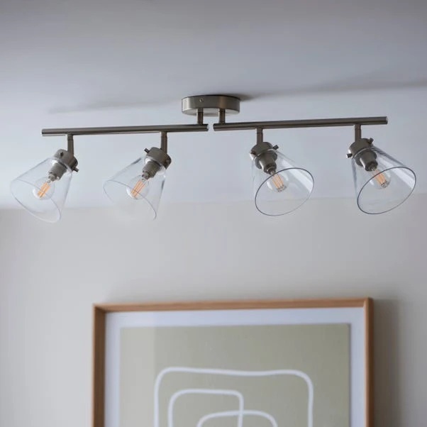 Light up your home with this stylish Delavin 4 Light Satin Nickel Spotlight Bar. This modern light features 4 clear glass shades with adjustable heads to allow for optimum direction of light and a satin nickel effect finish on the base, the folding bar allows for greater adjustment options. This spotlight bar is dimmable and perfect for adding a contemporary look to your room, with matching family items available to help coordinate your home.