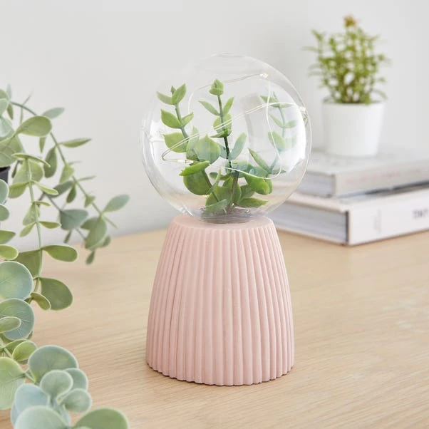 Enhance your space with the Faux Terrarium Ribbed Battery Operated Lamp with its rib-shaped concrete design which adds texture to your home decor. The lamp is adorned with faux foliage and 7 copper wired lights, creating a captivating display. With a push bar switch, it’s easy to operate. Ideal for showcasing on shelves or window sills, this lamp requires 2 AAA batteries, so don’t forget to add batteries to your basket!