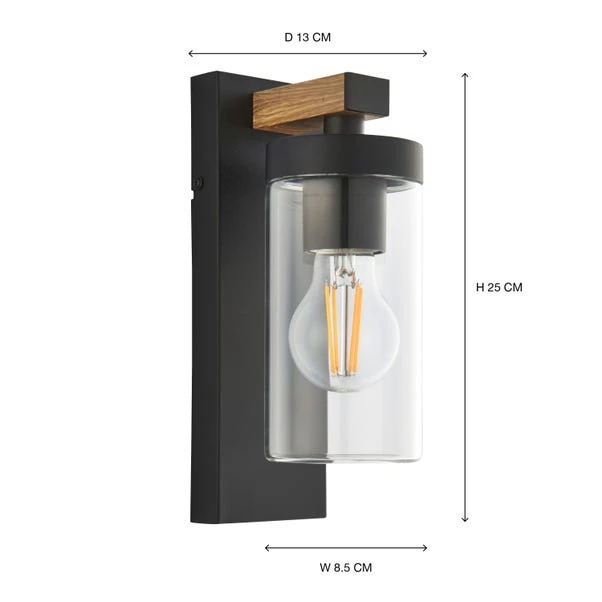 This fixture is designed to enhance both indoor and outdoor spaces, providing a cohesive lighting experience throughout your home. The matte black finish with a dark wood effect fitting exudes modern sophistication, while the clear glass shade adds a touch of elegance. Coordinate your lighting style seamlessly with matching family items, available to purchase separately.