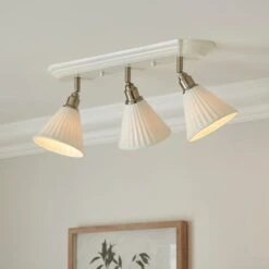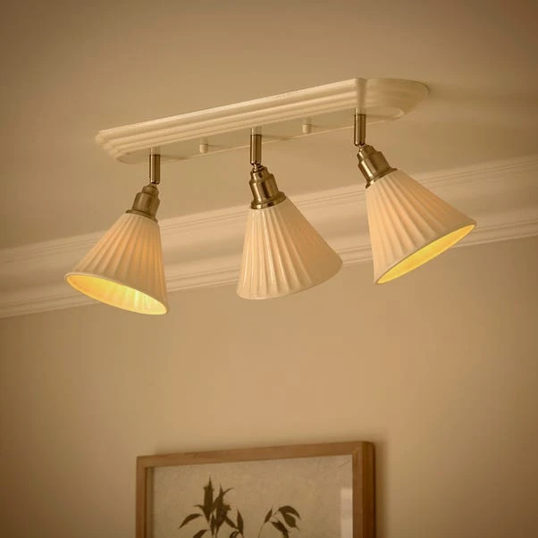 Featuring glossy ribbed ceramic tapered shades, this 3 light flush spotlight emits a warm, inviting glow. The fluted dome shape and adjustable heads make it a chic and functional choice for any room.