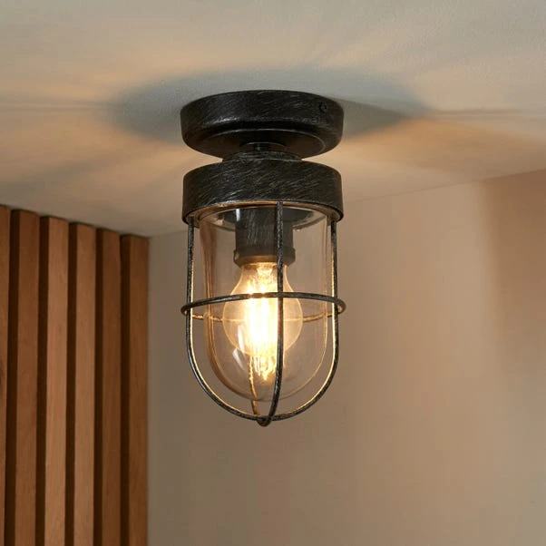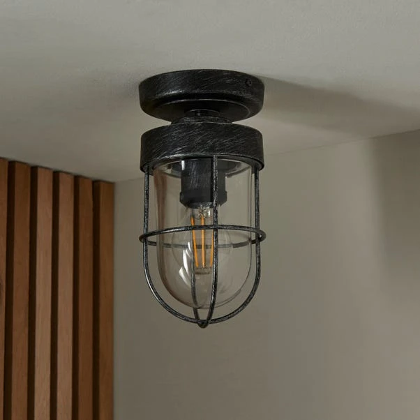 Introduce a modern contemporary look to your home with the Marine Industrial Ceiling Fitting. This industrial style flush fitting is finished in aged pewter paint, and a clear glass shade. Complete with IP44 rating, so its suitable for use in the bathroom. The Marine flush fitting is dimmable with a compatible bulb and light switch, as well as suitable for use with LED lamps. Matching items from the Marine range are available to help coordinate your home.
