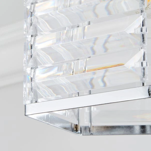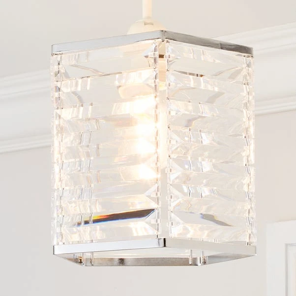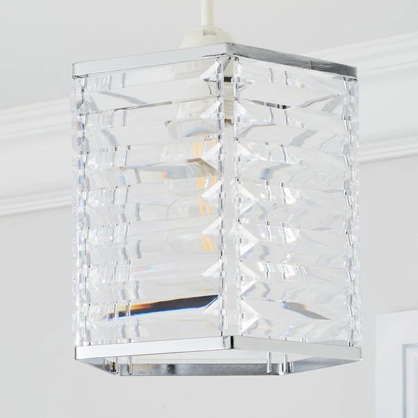 This acrylic pendant features a 5 side prism detail with clear, acrylic prisms with a metal edge finish. The pendant will connect easily to your existing lamp holder and would look perfect in any chosen room of the house. Easy Fit pendants are ideal for a quick style change without needing an electrician. Simply assemble on to your existing ceiling fitting, and youβre good to go within minutes! Donβt forget to choose the correct bulb for your ceiling fitting.