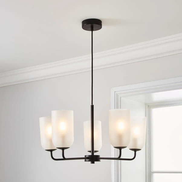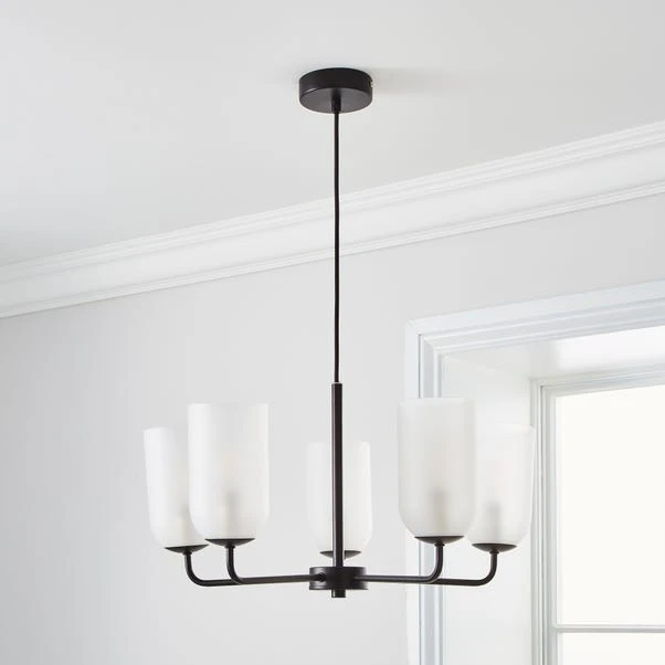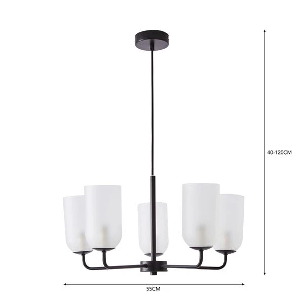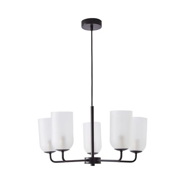 Add a luxury finishing look to your home with our Palazzo Chandelier light featuring five frosted light shades and a sleek black finish. The black fabric cable is adjustable so you can adjust the height according to your desires. It’s compatible with a dimmer switch so you can set the perfect ambience no matter the occasion. Good things come to those who coordinate, so why not pair this Chandelier with the matching items available?