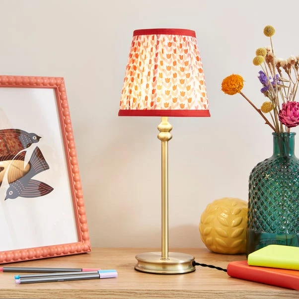 This lamp features an exquisite antique brass plated finish, adding an aura of sophistication to any space. Its distinctive ditsy printed lampshade, accentuated with a vibrant red trim, is a delightful complement to the lamp’s overall design. The standout feature of this lamp is the stunning stacked bobble design, which adds texture and visual interest, making it an eye-catching addition to any room.