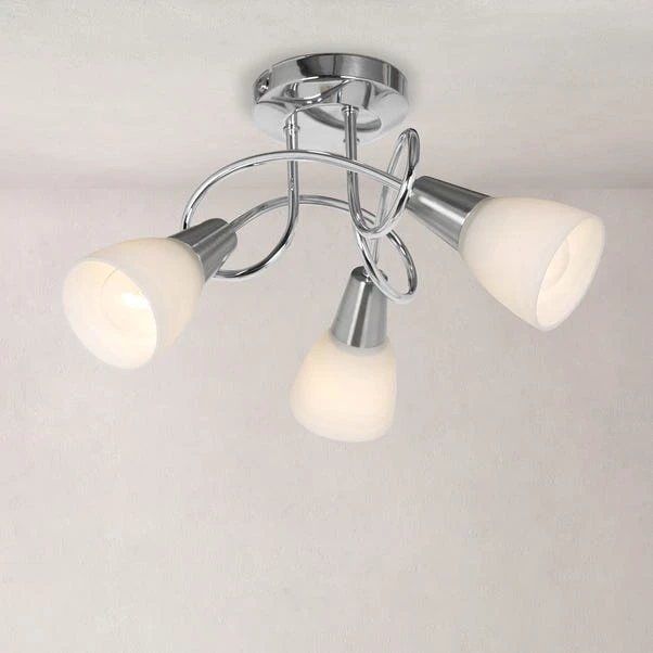 Designed with three swirling interlocked metal arms which hold three light shade fittings, this modern ceiling light features cream coloured glass shades and a chrome finish.