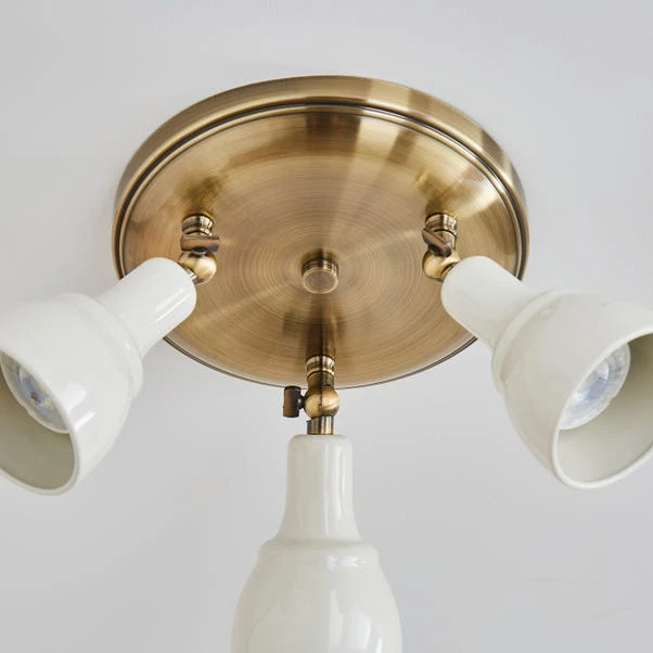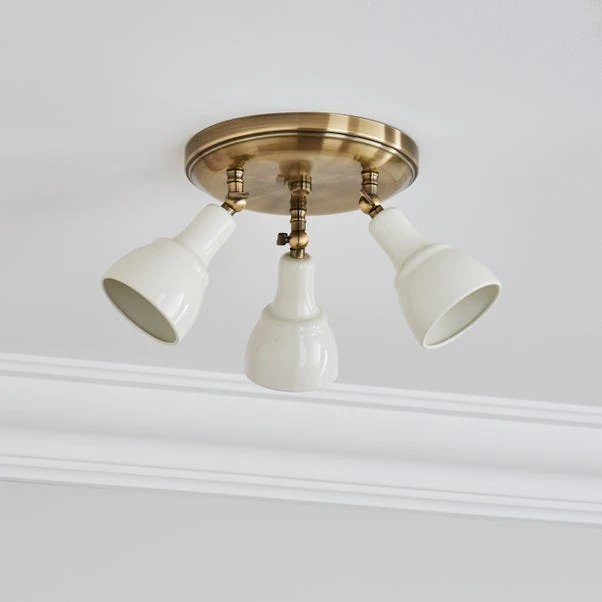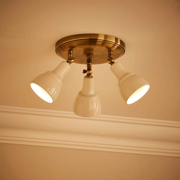 A stylish and versatile lighting solution designed to enhance your living spaces. The adjustable spotlight heads allow you to direct light precisely where it’s needed, providing both functionality and aesthetic appeal. Finished in an elegant antique brass, this spotlight adds a touch of timeless sophistication to your home. The glossy ivory shades add a subtle contrast, creating a warm and inviting ambience. Compatible with dimmable bulbs and switches, the Wybridge Spotlight offers flexibility in setting the perfect mood. Coordinating family items available to purchase separately.